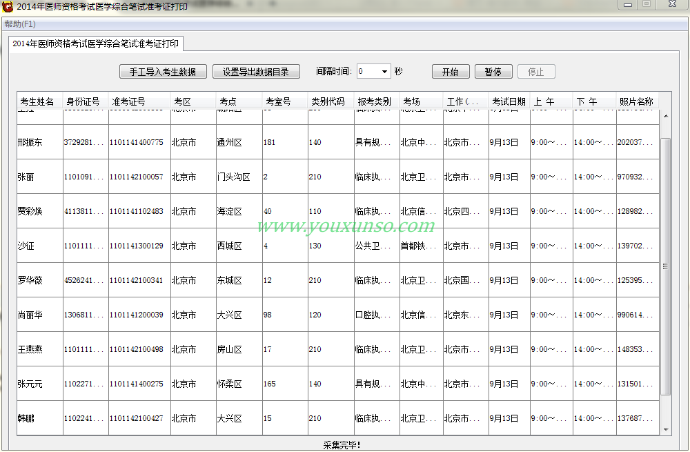 医师护士准考证以及考试成绩批量查询器主要功能是:批量导入考生的姓名及身份证号码,然后逐一对其查询准考证信息或者考试成绩信息,导出excel表格。