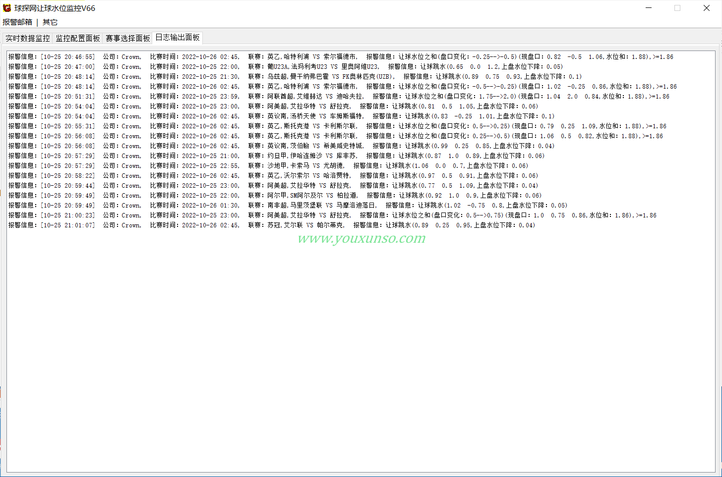 球探网让球水位监控V66的主要功能:实时监控球探网“今日比赛”页面中进行中比赛的亚盘变化情况,当变化情况满足如下几种条件时进行报警提示,报警提示有软件界面浮层提示、声音提示、发送邮件提示三种。需满足的监控条件如下: